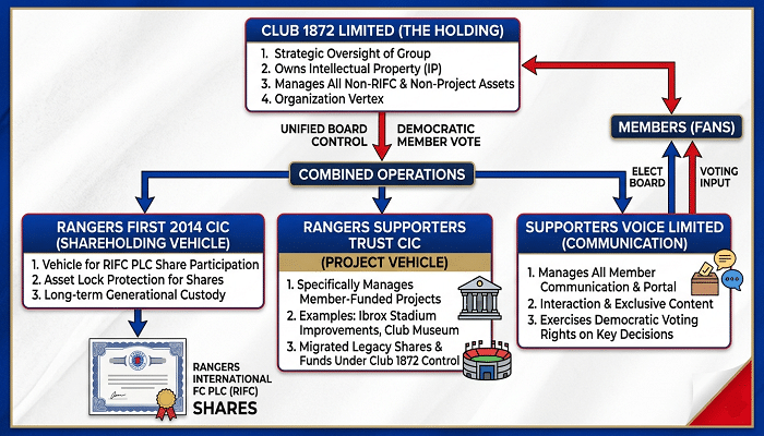 Il Club 1872 non è una singola entità, ma un’organizzazione ombrello con una struttura giuridica complessa, concepita per proteggere i beni dei tifosi e garantire loro un peso nel consiglio di amministrazione dei Rangers Football Club.